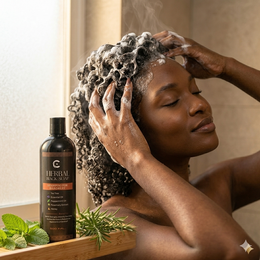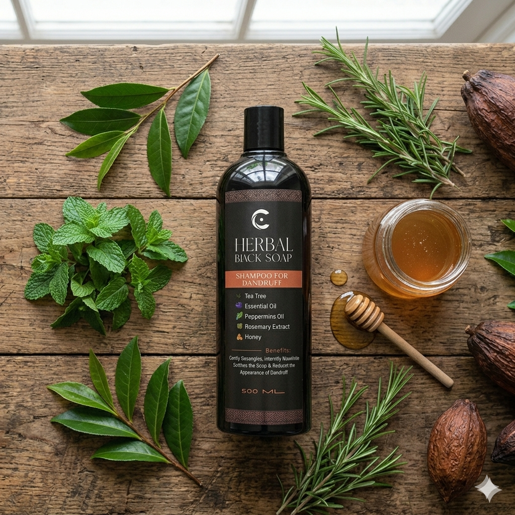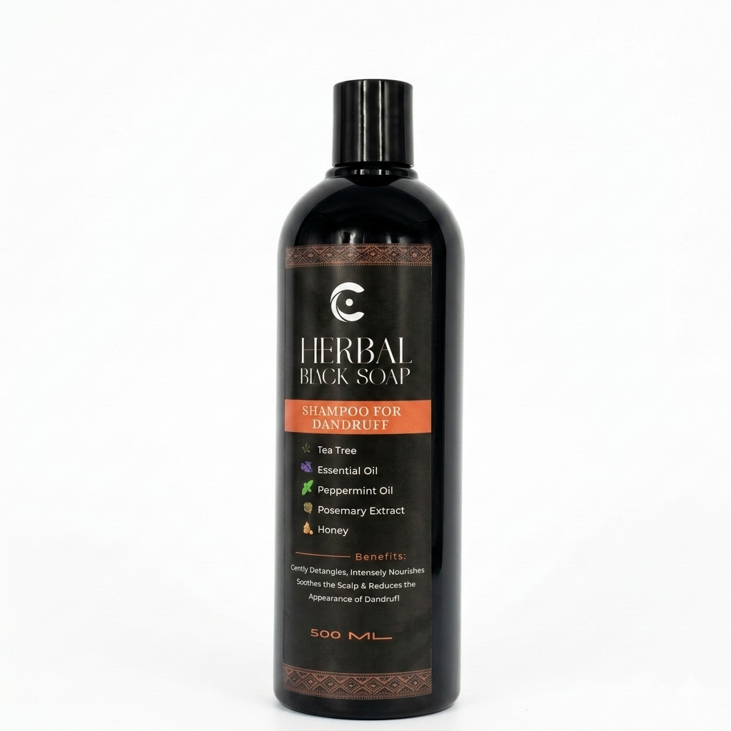 Combat dandruff effectively with our dandruff shampoo 500ml, bottle perfect for the whole family. It combines the purifying power of black soap with tea tree oil, peppermint, rosemary, and honey. Therefore, it soothes irritation, reduces itching, and helps eliminate flakes.